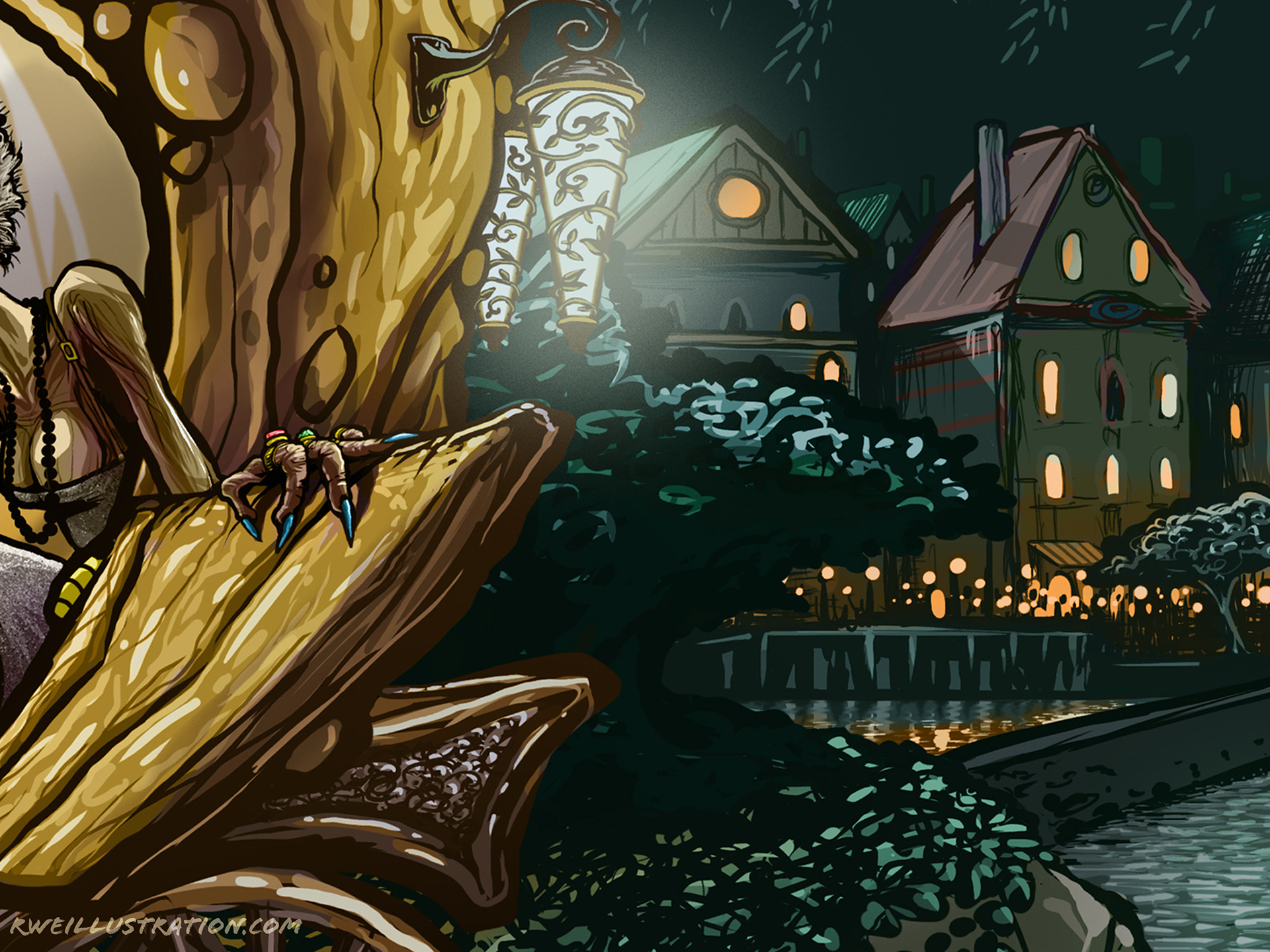I wanted to put the viewer in the glass slippers, and emphasize the discomfort and surreality of the scene–while still maintaining a haunting beauty. All elements were originally designed and digitally painted over a scan of a physical drawing.