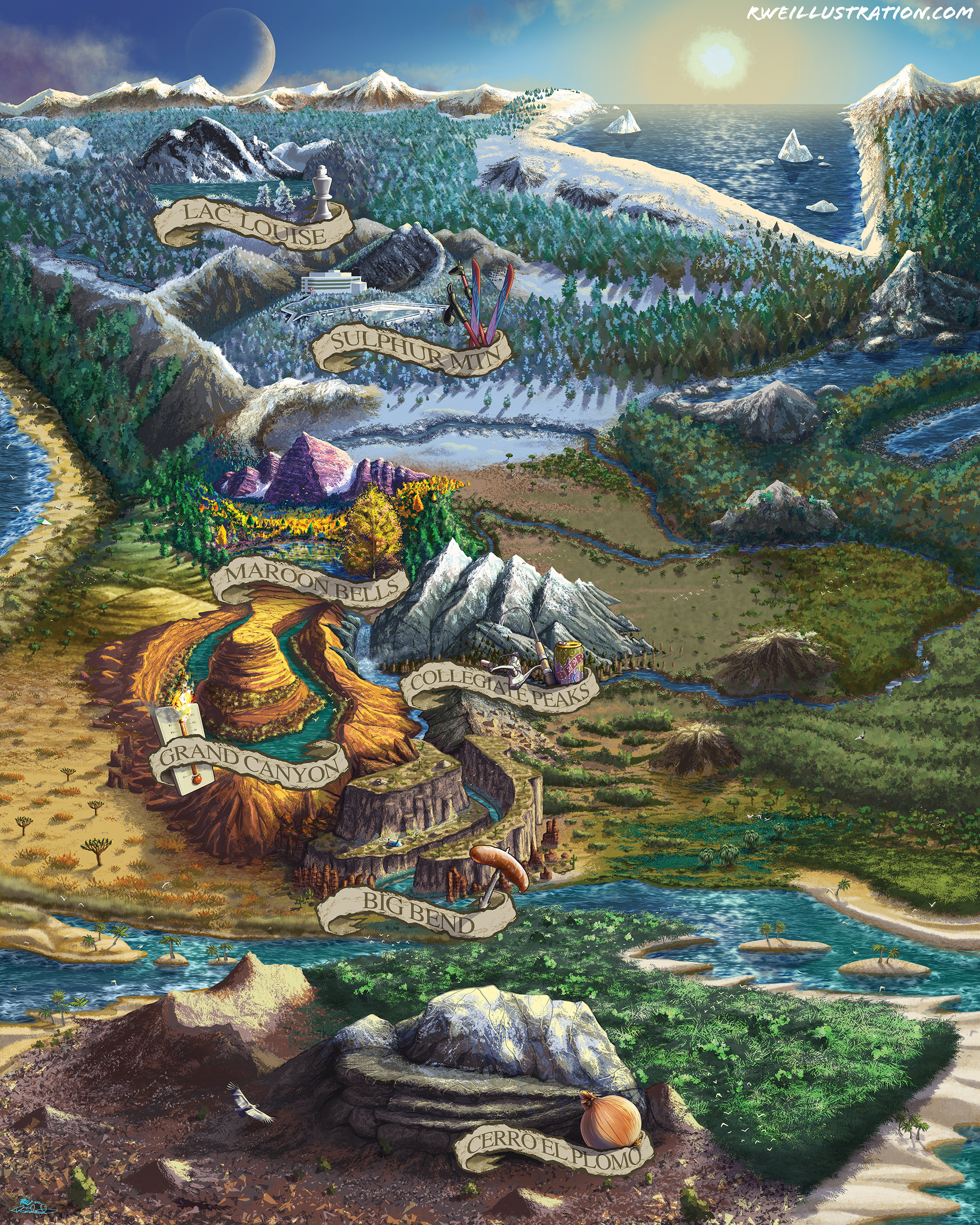 This illustrated map was commissioned by a couple to celebrate their wedding anniversary. Inspired by the style of fantasy maps found in classic literature, the piece depicts many of their favorite hiking destinations over the years. Each location was rendered using reference photography and incorporates symbolic objects and environmental details that reflect their experiences there. The final artwork was produced as a large-format print.