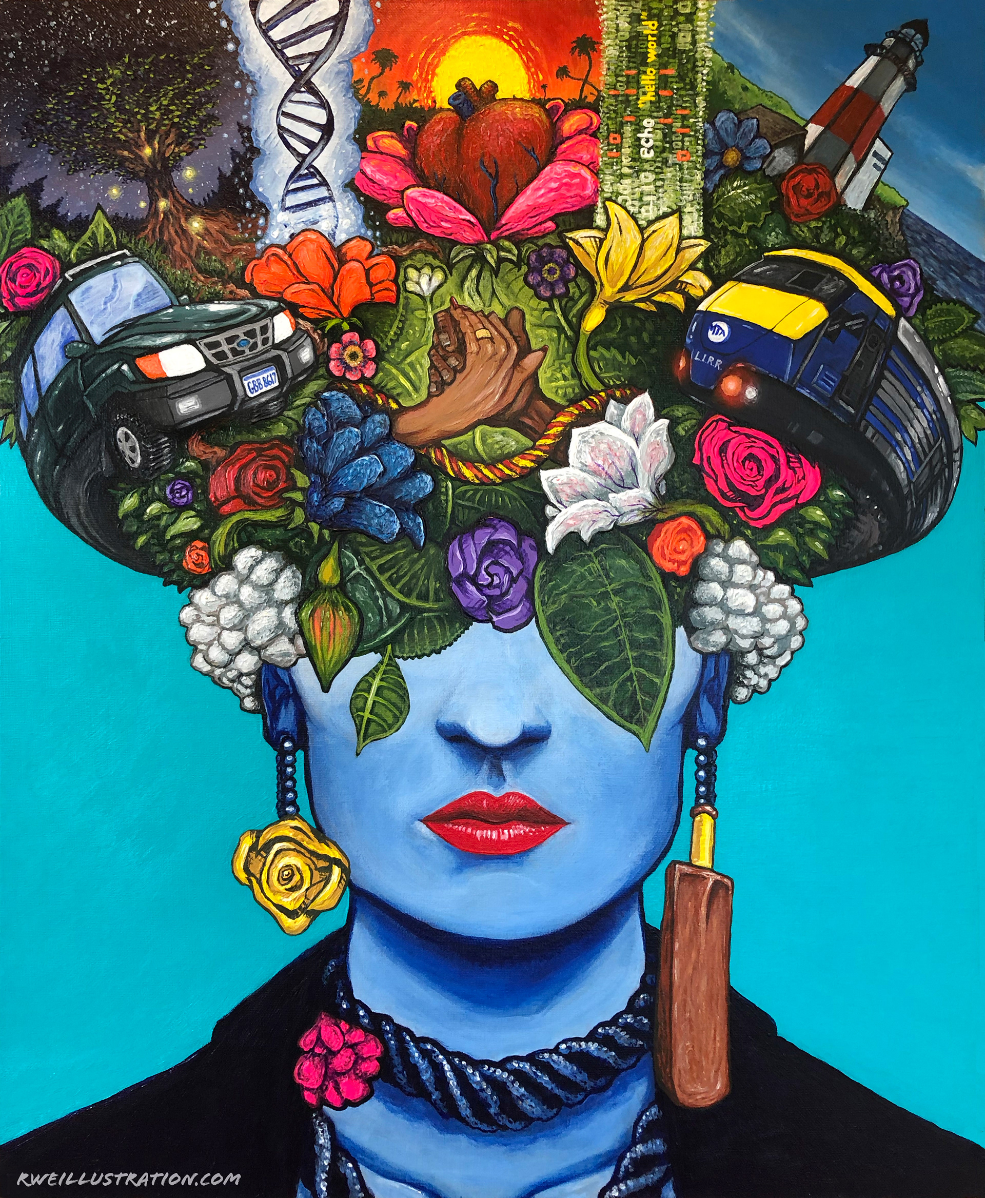 This portrait was commissioned by a couple seeking a symbolic painting inspired by the visual language of Frida Kahlo. The composition incorporates flowers and personal imagery representing their shared history, heritage, and interests, including references to where they met and meaningful moments from their lives together. The design and placement of each element were carefully developed through multiple sketch iterations before the final painting was executed.