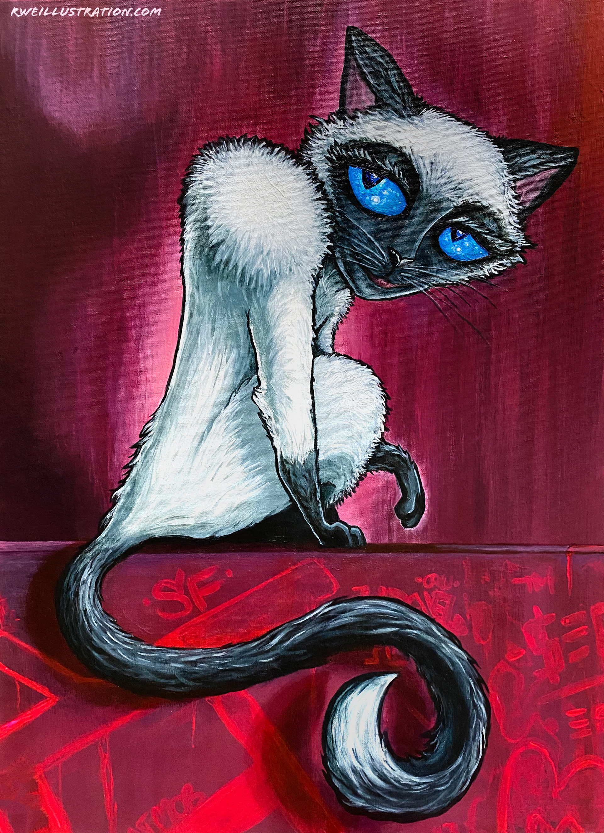 Created as part of a two-piece private commission, this painting is a stylized portrait of the client’s cat. Working from reference photos and the client’s descriptions, the piece focuses on capturing the animal’s distinctive personality as well as its likeness.