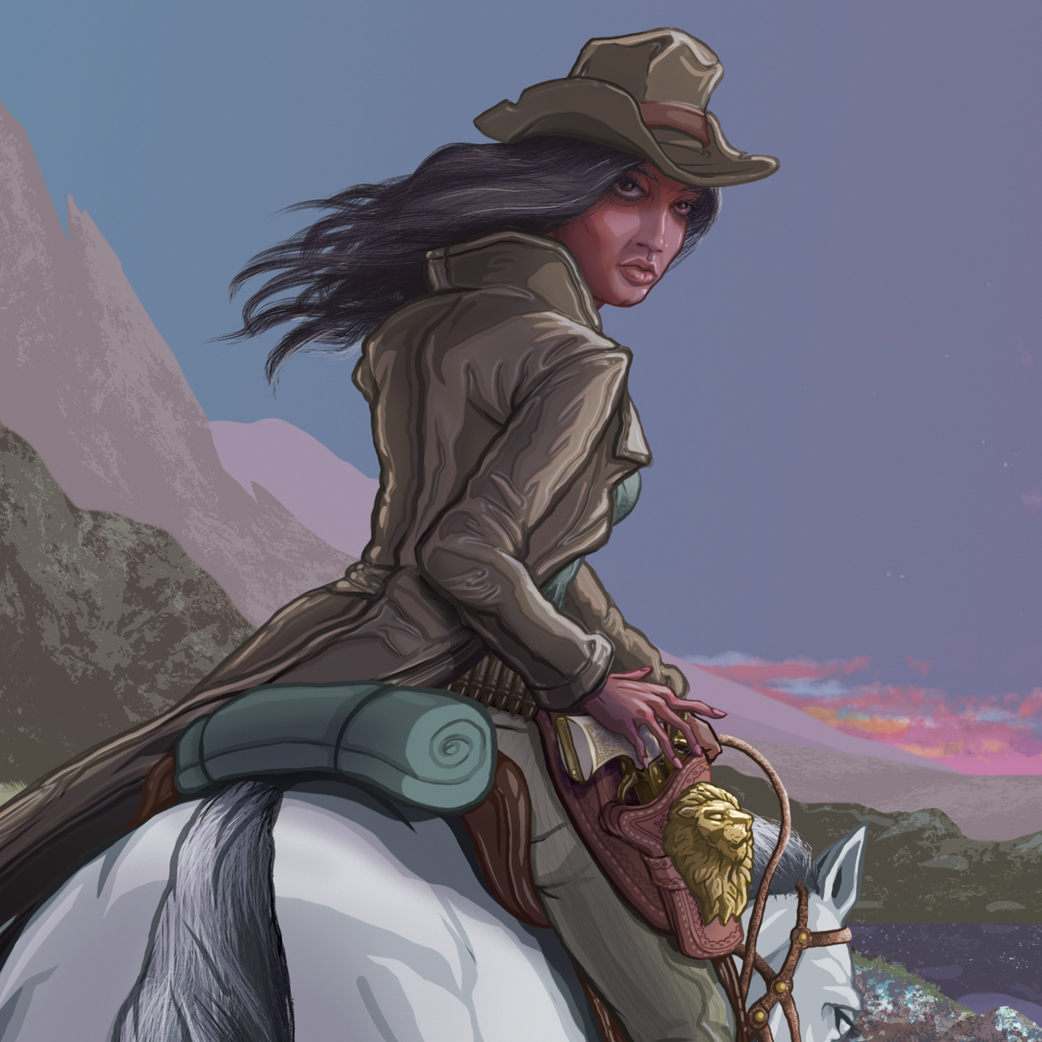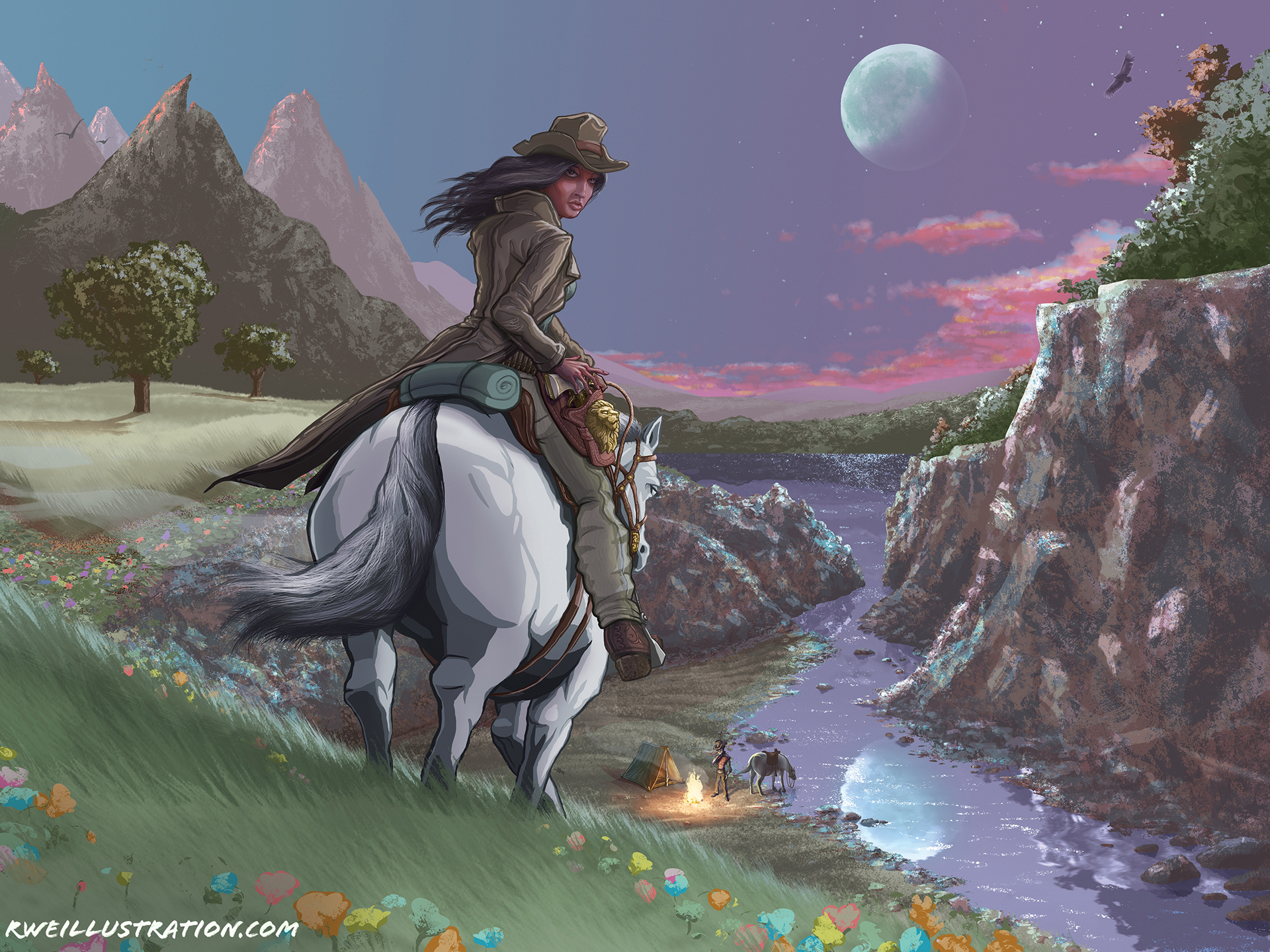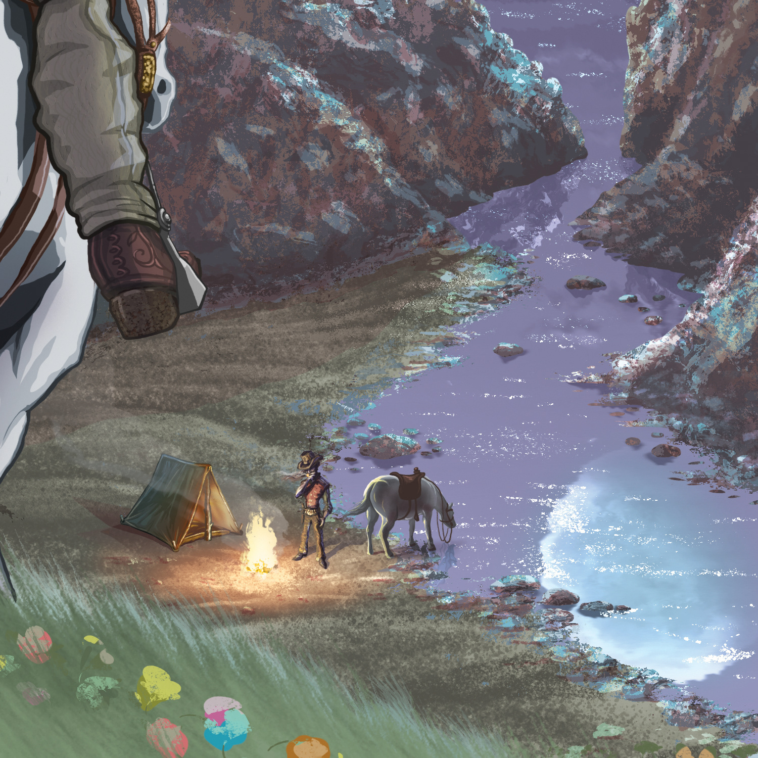 This illustration was commissioned as a personal gift and combines visual influences from classic Western imagery, and the atmospheric landscapes and detailed figures often seen in anime films. The composition depicts a rider approaching a campsite at dusk, emphasizing the contrast between soft, luminous scenery and solid character silhouettes. The figure at the campfire was modeled after the client, incorporating subtle likeness references into the narrative scene.