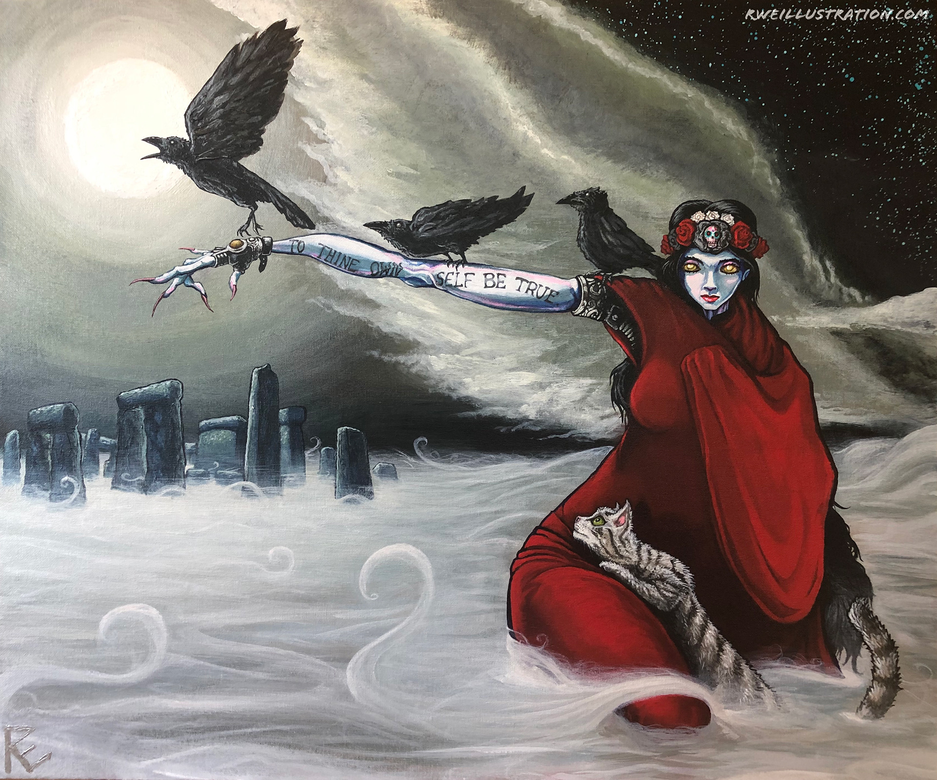 Commissioned by a client with an interest in mythology and gothic imagery, this painting presents my interpretation of the Celtic goddess Morrigan. The composition incorporates crows, standing stones, and dramatic cloud formations, along with the Shakespearean line “To thine own self be true,” emphasizing themes of self-determination and personal destiny.
