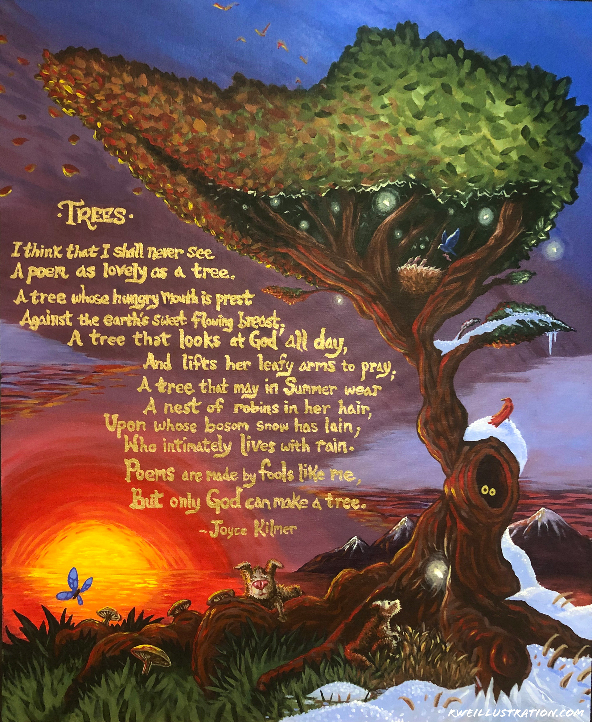 This painting was commissioned as a whimsical illustration inspired by Joyce Kilmer’s poem “Trees.” The composition represents the changing seasons within a single tree, incorporating animals and small narrative details throughout the branches and roots. The poem itself was hand-painted into the composition to integrate the text and imagery into a unified scene.